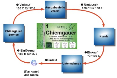 Um den Kreislauf am Leben zu halten, verliert der Chiemgauer an Wert, wenn er nicht zum Bezahlen von Waren oder Leistungen verwendet wird, und zwar 2% im Vierteljahr. Damit ist jeder bestrebt, erworbene Chiemgauer auch wieder auszugeben. Am Ende sollen damit einerseits der regionale Wirtschaftskreislauf angeregt und andererseits unterstützende Mittel für die regionale Kulturarbeit in den Vereinen erwirtschaftet werden.
