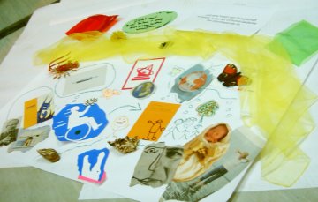 Nach einer kurzen Kritikphase fand eine etwas längere Utopiephase statt. In deren Ergebnis wurden zwei Collagen gestaltet, von denen ein Ausschnitt in dem Bild zu sehen ist: